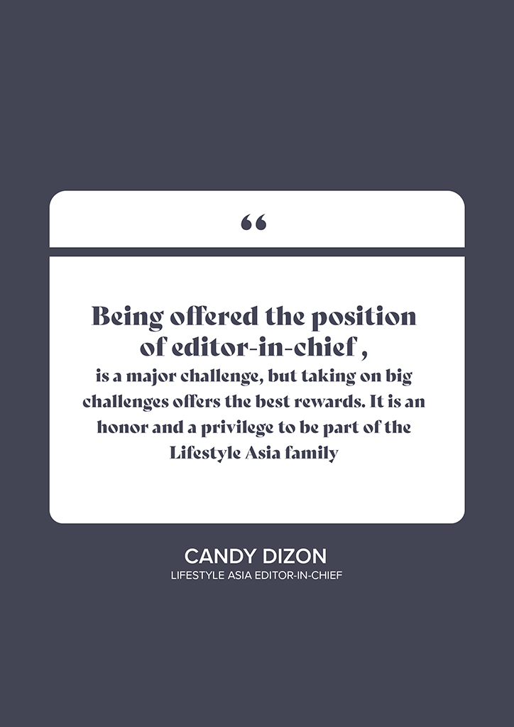 Despite having big shoes to fill, she is confidently ready for the challenge. “Being offered the position of editor-in-chief is a major challenge, but taking on big challenges offers the best rewards. It is an honor and a privilege to be part of the Lifestyle Asia family,” Dizon prefaces before her maiden issue.